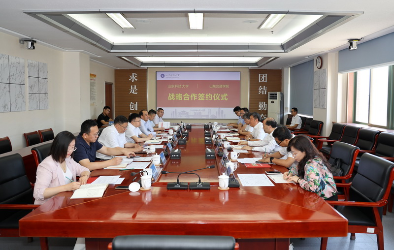 6月12日,山东科技大学与山东交通学院签署战略合作协议。校党委书记王君松、山东交通学院党委书记王伟分别致辞,校长曾庆田、山东交通学院院长孔伟金出席仪式,副校长诸葛福民与山东交通学院副院长王保群代表双方签署协议。