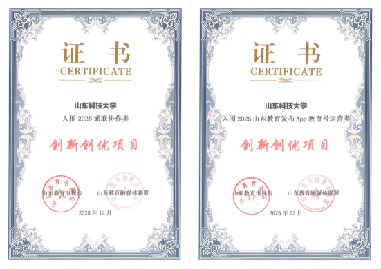 本次评选活动由山东省教育厅指导,山东教育融媒体联盟主办,对2025年山东教育融媒宣传工作中涌现出的先进单位、优秀个人及作品进行了表彰。我校入围2025通联协作类创新创优项目、2025山东教育发布APP教育号运营类创新创优项目;作品《【教育强国奋斗有我】陈绍杰:光明“碳”路者科技引路人》入围2025电视新闻单元创新创优作品,作品《山东科技大学大变身,毛绒绒来袭》入围2025AIGC单元创新创优作品,作品《青春不散场,逐梦启新程》入围2025短视频单元创新创优作品,作品《三个月,爆肝五百万方块,他们把嵙大搬进了我的世界》入围2025跨界创新单元创新创优作品;韩洪烁荣获“2025山东教育发布App运营类创新创优典范”称号,孙艳、周俞汛荣获“2025通讯类创新创优典范”称号。