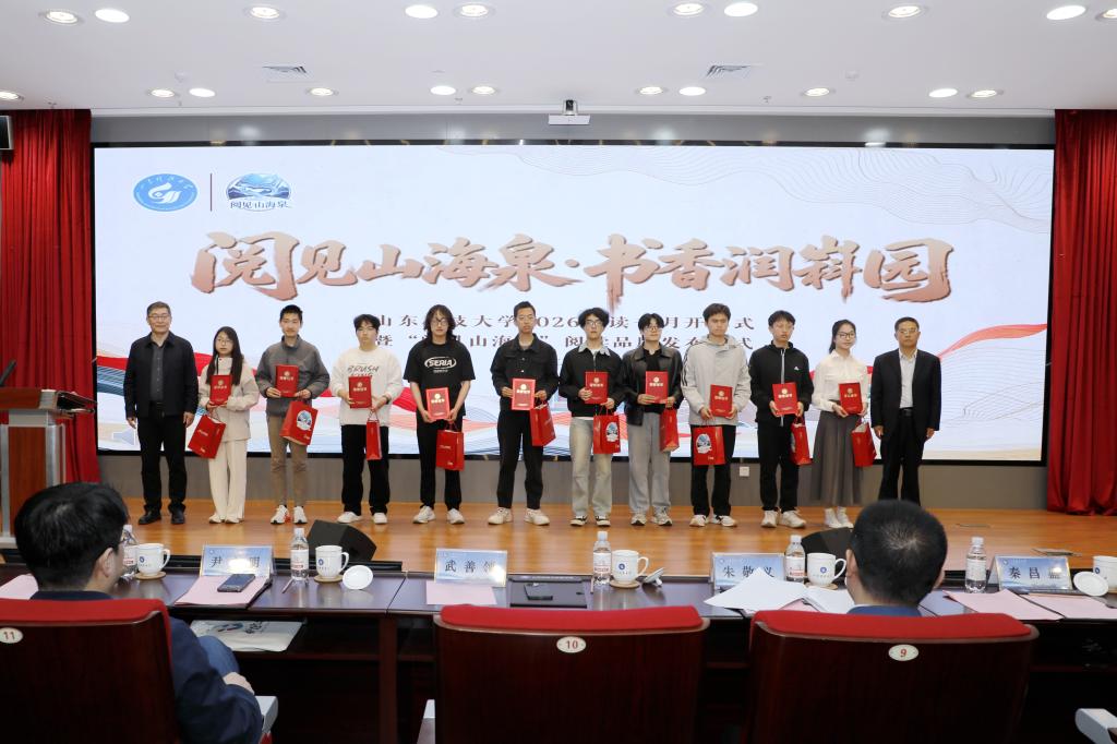 仪式上,朱敬义按下启动按钮,“阅见·山海泉”阅读品牌LOGO正式亮相。随后,与会领导共同启动读书月活动,对品牌内涵与LOGO设计理念进行详细解读,宣读2026年读书月活动方案和“阅读之星”表彰决定,为获奖教师、学生代表颁奖。学生代表王文鑫、教师代表孙金香先后发言,分享阅读心得并发出阅读倡议。