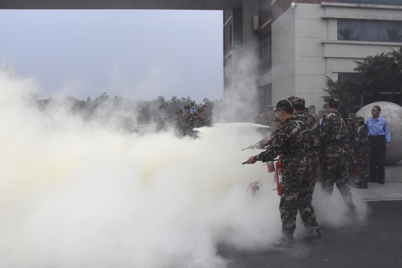 学生工作处处长诸葛福民宣布演练开始后,模拟火灾发生,消防广播响起,学校志愿消防队赶赴火场救火并维持秩序,参演学生在引导人员的引导下快速有序地按照规定路线低姿撤离。消防官兵赶到火场,演示利用消防车灭火及利用云梯营救火场被困人员,并对学生代表、学校志愿消防队和物业管理员分别进行了使用灭火器灭火、使用消防栓灭火的消防技能培训。
