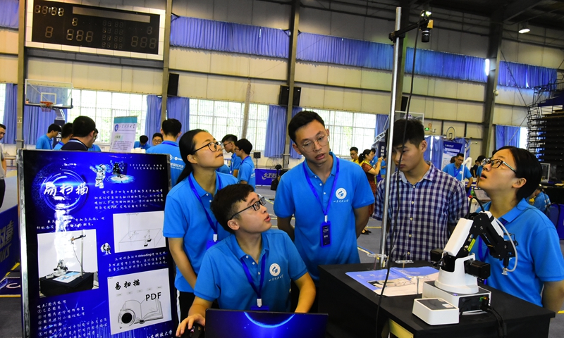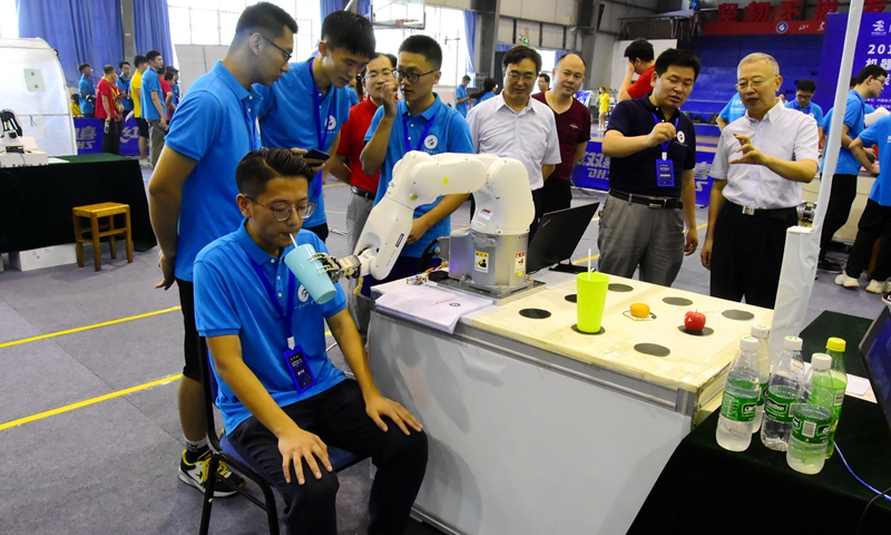 “在医院里取药总是要排很长的队?我们设计这个取药机器人来帮你解决问题。”在比赛现场,山东科技大学“嵙华佗”战队展示的取药机器人吸引了大家关注。团队里自动化专业大三学生卢俊彦负责设计“机器人眼睛”,让机器人识别要买的药是什么;他的同学陈建业负责设计“腿脚”,让机器人动起来;电气专业的张华峰和任传鹤则分别负责设计“机器人的手和大脑”,让机器人各部分能交互通信并抓取药品。
