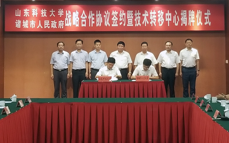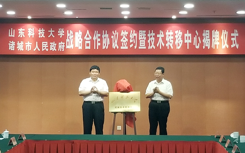 近日,山东科技大学与诸城市人民政府战略合作协议签约仪式在诸城市举行。山东科技大学副校长刘孟德,诸城市委书记桑福岭出席仪式,并为“山东科技大学•诸城技术转移中心”揭牌。