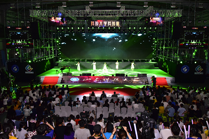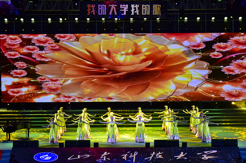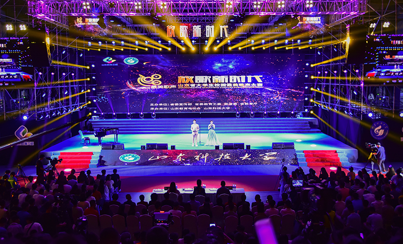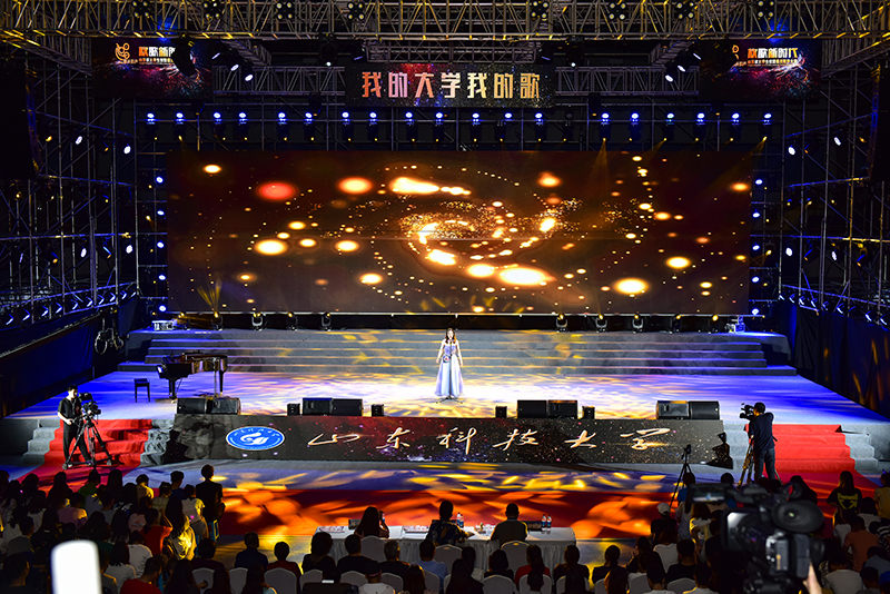 校党委副书记尹华、副校长高建广、山东教育电视台副台长陈泽河及各参赛高校相关负责人在现场观看比赛。两位主持人简要介绍了山东科技大学的基本情况。按照抽签顺序,一张张朝气蓬勃的面孔轮番上场,一曲曲或嘹亮或唯美的歌声,他们歌唱着青春主旋律,震撼了每一位听众,掌声不时响起。比赛现场群情激昂,扣人心弦,高潮迭起,观众手持“手机荧光棒”激情挥舞,掌声与喝彩声交相辉映。