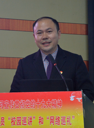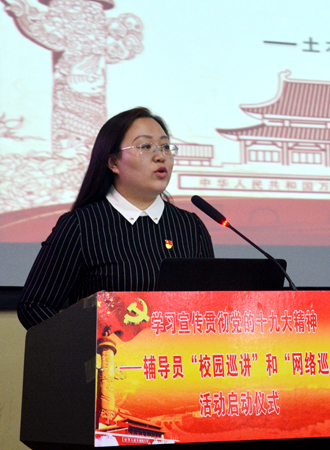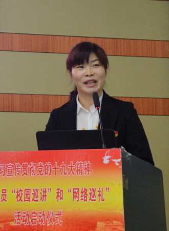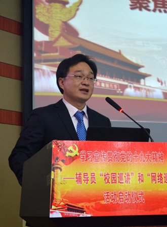 尹华发表动员讲话。他阐述了党的十九大和开启辅导员“校园巡讲”“网络巡礼”的重要意义,希望辅导员利用自身工作优势,把道理讲清楚,把热点讲透彻,把难点讲明白,引起学生“同频共振”;利用身边事,讲述身边理,与学生实际生活紧密结合,运用大众化语言,以通俗易懂的方式,引导广大学生真学、真懂、真信、真用;学生通过“面对面”聆听,感受宣讲者的情感温度,从而“亲其师而信其道,辅导员等通过“键对键”,对学生进行文字、视频、图片等方位、多渠道、深层次的宣传教育,真正让十九大精神在校园落地生根、开花结果。