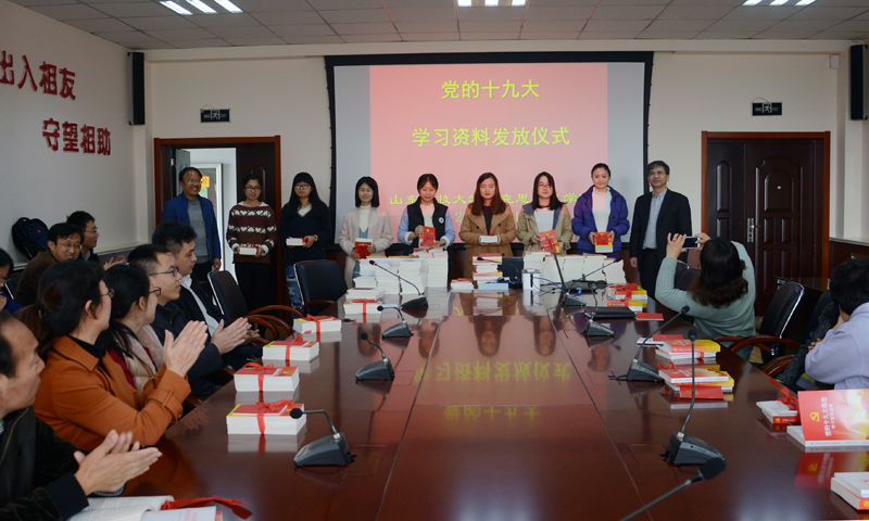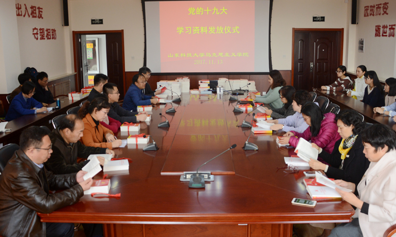 11月13日,马克思主义学院举行党的十九大精神学习材料发放仪式,集中向学院师生发放学习材料。这些材料包括《党的十九大报告辅导读本》《学习辅导百问》等共5本,由青岛市委宣传部提供,学院师生人手一套。仪式由副院长邵勇主持,马克思主义学院全体师生参加了活动。