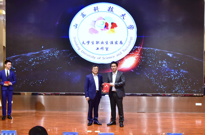 与会领导、嘉宾共同启动大学生职业生涯发展工作室,高建广为大学生就业指导师代表李腾飞颁发了校外导师聘书。据悉,工作室将积极开展职业测评、团体辅导、个体咨询、创新服务等工作,邀请生涯教育专家、优秀校友、成功人士走进学校加入师资团队,为学生提供个体咨询服务。