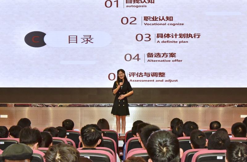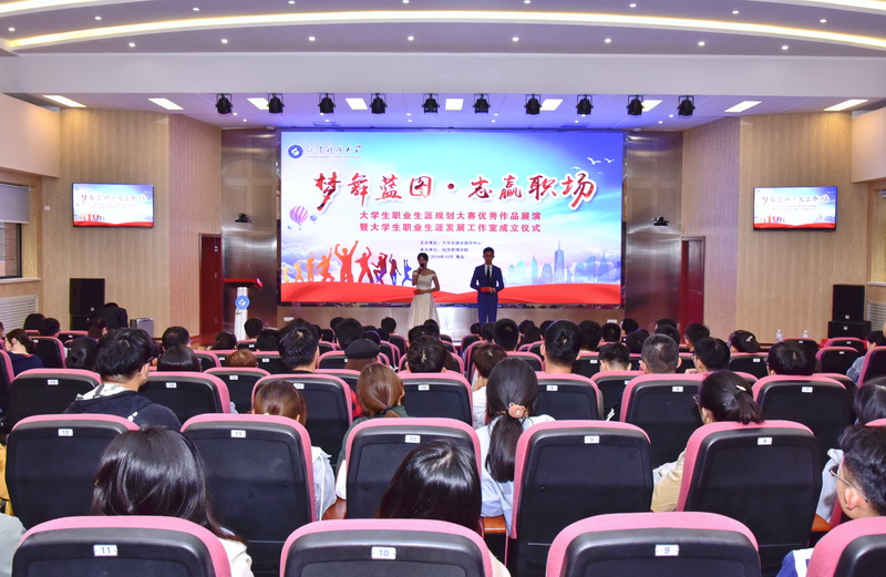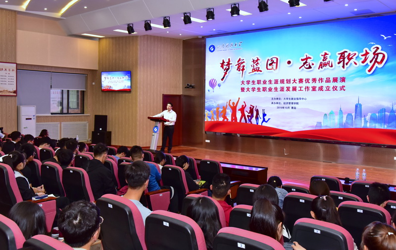 “三尺讲台是我的梦想,结合自己的性格特点、兴趣爱好以及专业特长,我为自己设立的职业目标是成为一名新能源材料学大学教师,在平日的校园生活中,便以‘为人师表’严格要求自己,参加小草学堂,加入支教行列……”“我渴望成为外企财务总监,我辅修了英语第二专业,四六级也已顺利通过,并在假期中前往信达证券青岛珠江路营业部实习……”青岛市大学生职业生涯规划大赛、学校大学生职业生涯规划大赛获奖选手代表荆佳怡、魏亚倩、李悦、管志伟、张圣予分别上台展演,从主题陈述、情景模拟等方面讲述自己职业生涯的追梦故事。他们从容不迫、慷慨激昂地向观众展示了自身的职业生涯的“自我认知”“环境分析”“目标设定”“职业路径选择”以及“行动计划与策略”等规划与实施,赢得了现场阵阵掌声。