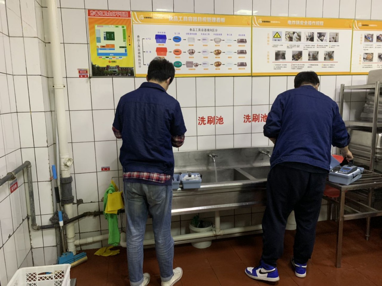 水务公司高度重视学校供水工作,5月22日上午,专门安排供水所、水质监测、供水巡线等部门专业人员来校指导工作。首先,供水人员对校园内供水管道进行冲洗,自来水冲洗约计10分钟后,水质监测人员提取水样,现场检测自来水浊度和二氧化氯是否符合标准。随后,水务公司人员来到学生公寓和学生餐厅,对公寓盥洗间和餐厨加工间供水管道进行自来水冲洗和水质监测。经检测,以上水质均符合国家生活饮用水标准。