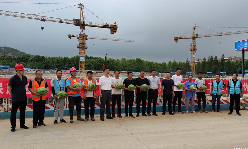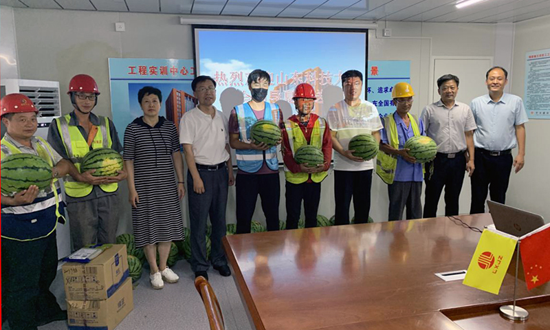 炎炎夏日,高温持续,建设工地正在经受严峻“烤验”。8月6日,学校组织开展在建项目工地抗高温、战酷暑、送清凉慰问活动。校工会、基建处等部门单位负责人率相关工作人员,深入图书信息中心、工程实训中心施工现场,给坚守工作岗位上的工人师傅们送去西瓜、绿豆、绿茶等防暑降温物品,代表学校向辛勤劳作的一线工人表示慰问。