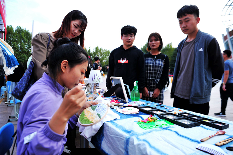 在手工艺展演现场,刺绣展区吸引了不少女同学的驻足。地科学院2020级新生桑晓聪告诉记者:“这些展品都很精致,实现了传统工艺和现代感的一种融合,没有丢弃传统手工工艺的面貌,用古老的传统绣法秀出可爱活泼的卡通图案,我觉得非常漂亮,非常喜欢。”