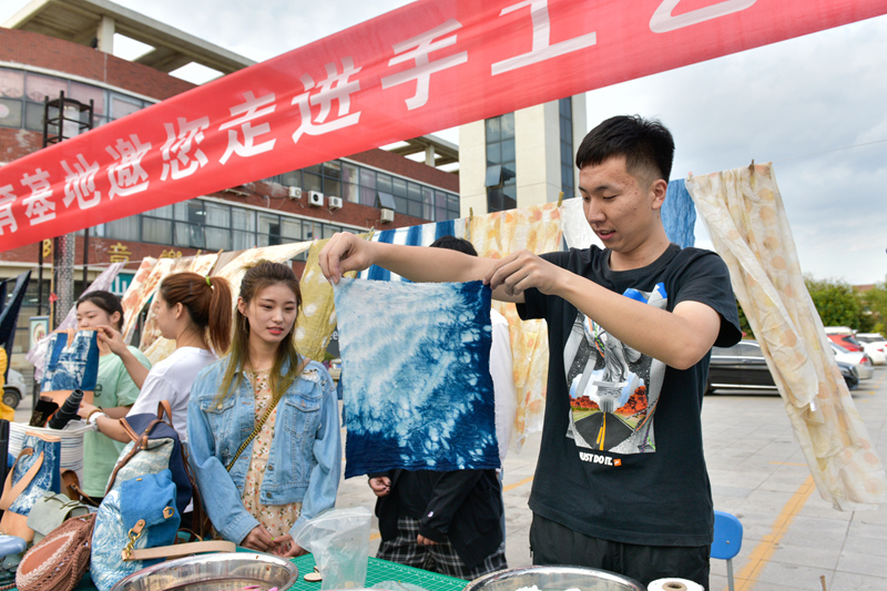 在印染区,为了让同学们有更好的印染体验,艺术学院学生王晓蕾一边忙着手中的活,一边介绍道,“大家看,这是‘蓝染’用的染料,是用板蓝根的根熬制的,纯植物印染,不加任何化学添加剂的,感兴趣的同学们可以过来体验。”