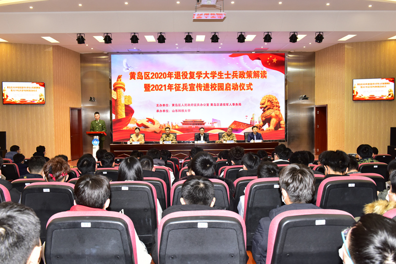 12月24日,黄岛区2020年退役复学大学生士兵政策解读暨2021年征兵宣传进校园启动仪式在学校举行。黄岛区委常委、区人武部政委闫明智,黄岛区人武部部长柳伟,黄岛区退役军人事务局局长王立军,山东科技大学党委常委、副校长高建广出席活动,并为2020年退役复学大学生士兵代表发放一次性经济补助金。