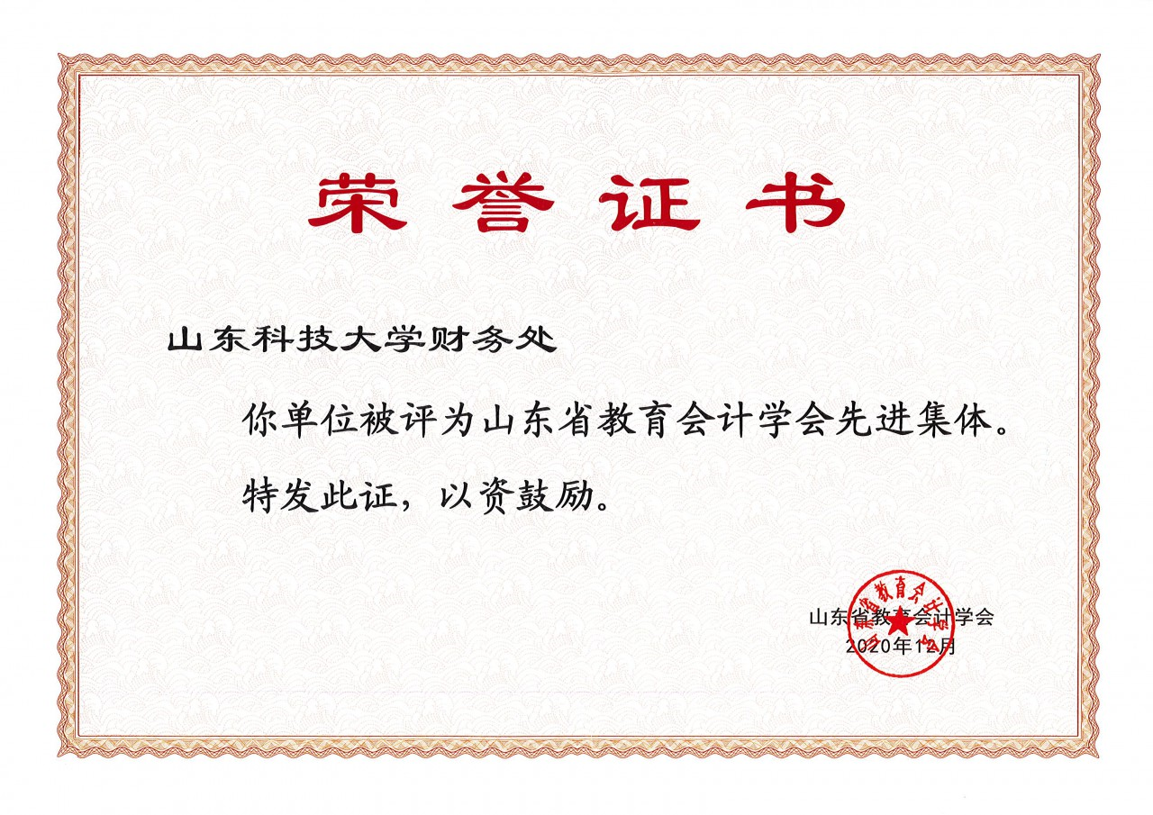 近日,山东省教育会计学会开展2020年度全省教育财会先进集体、先进个人及优秀信息员荣誉称号评选工作。山东科技大学财务处获“2020年度山东省教育会计学会先进集体”荣誉称号,罗文奇、张星艺同志获“2020年度山东省教育会计学会先进个人”荣誉称号,马赫同志获“2020年度山东省教育会计学会优秀信息员”荣誉称号。(财务处供稿 责编:徐展)