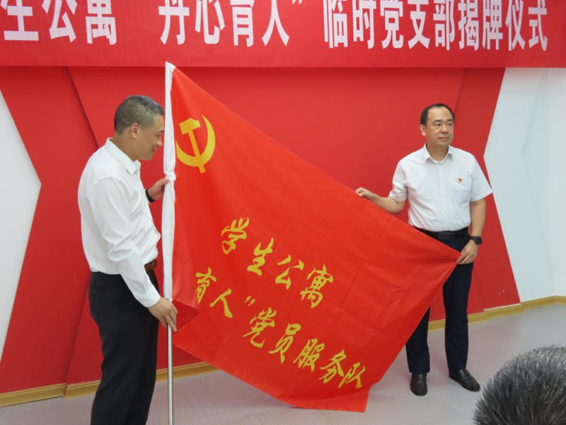 6月30日,经学校机关党委批准,我校学生公寓成立“丹心育人”临时党支部。副校长曾庆田出席仪式并为临时党支部授旗,机关党委书记李双立和珠海市丹田物业管理股份有限公司运营中心总监易若望共同为临时党支部揭牌,珠海市丹田物业管理股份有限公司党支部书记、总经理杨启萍,学生公寓“丹心育人”党员服务队11名成员参加揭牌仪式。