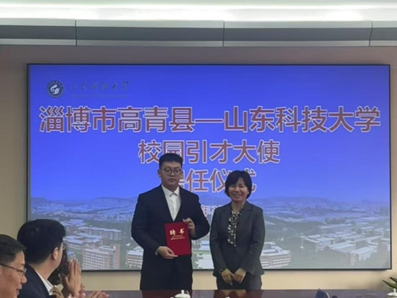 会上,双方围绕人才招引、科技成果转化、校地协同创新、高质量发展等议题展开深入交流,签署《校地融合助力高质量发展合作协议书》《科技成果转化合作协议》,举行“招才引智工作站”揭牌仪式,淄博市公共就业和人才服务中心副主任刘莹为“校园引才大使”颁发聘书。