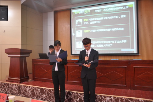 决赛共分两轮五个环节,包括“是真的吗”、“时政论述”、“举牌抢答”、“看图识标”和“热词解释”。比赛中,各队选手依次上台进行简短的团队介绍,并开始答题环节。选手在场上答题,场下观众则为自己支持的选手进行微博加油。经过角逐,“手扶拖拉机修理队”摘得桂冠,天地会队以及必胜客队获得二等奖。