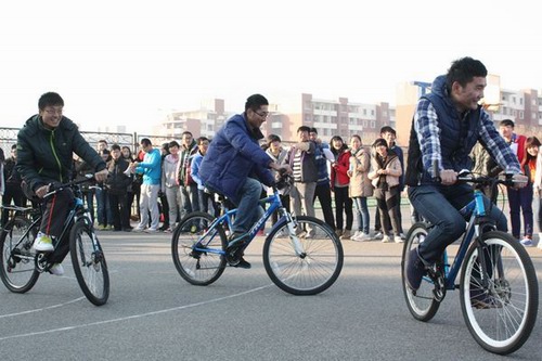 在“懒惰的自行车”环节中,选手们为了使自行车行驶速度最慢,需要用力握住车把并不断来回转动,活动现场充满