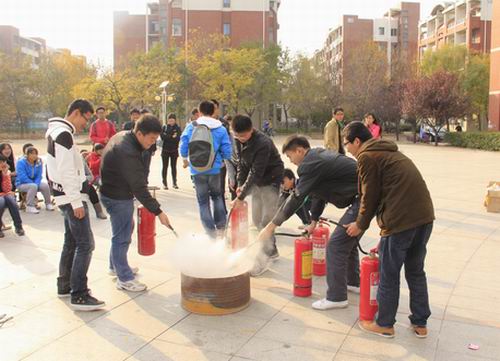 讲解了灭火器的基本构造、灭火姿势,并对如何使用灭火器灭火进行了分解示范。理论培训结束后,志愿者在李晓强的指导下进行了模拟火场灭火实战演练。