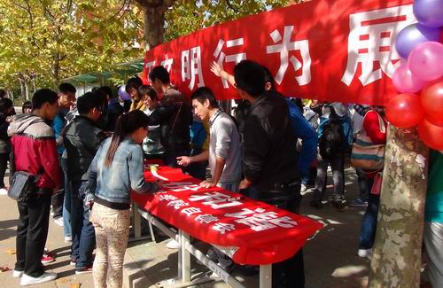 字样的条幅上签字,以表明摒弃不文明行为的决心。此外,活动还设有有奖趣味问答环节。