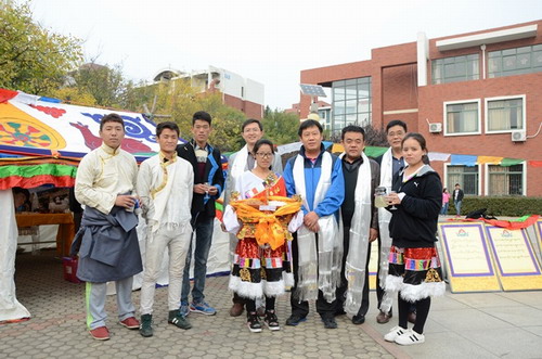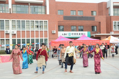 藏族同学端着装有糌粑的切码迎上前,现场领导与老师依次蘸起糌粑完成藏族礼节;藏族同学给老师们奉上青稞酒,献上洁白的哈达,表达对老师的欢迎和祝福。随后,在藏族同学的带领下,老师与同学们共同参观了展区。藏族的文字、礼仪、传统印刷、建筑、首饰、奶渣、青稞酒、酥油茶等令现场老师和同学赞叹不已,藏族同学表演的锅庄舞更是充分展示了藏族舞蹈的魅力。(通讯员:郑禾苗 姚升阳 实习编辑:范卫红)