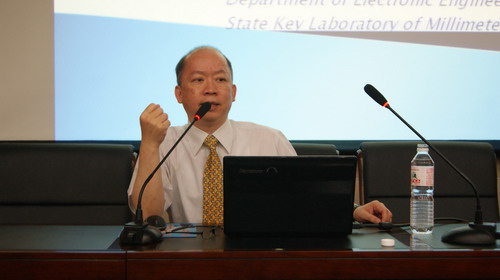 6月25日,香港城市大学电子工程系讲座教授、毫米波国家重点实验室主任陆贵文教授应邀为电子学院师生作了题为“磁电偶极子——用于无线通信的新型宽带天线”的学术报告。学院党委书记徐玲平、副院长曾庆田、通信工程系系主任王卓鹏,以及学院近200名师生一起聆听了报告。报告会由曾庆田主持。