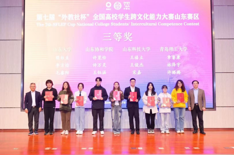 近日,第七届“外教社杯”全国高校学生跨文化能力大赛山东赛区(本科院校组)在青岛大学举办。山东科技大学由外国语学院英语专业22-2班的王禧立和经济管理学院工商管理专业23-3班的宋嘉、王俊杰组成代表队(指导教师:宋燕、杨晨晨、谭瑾)参与了此次大赛并获省级三等奖。
