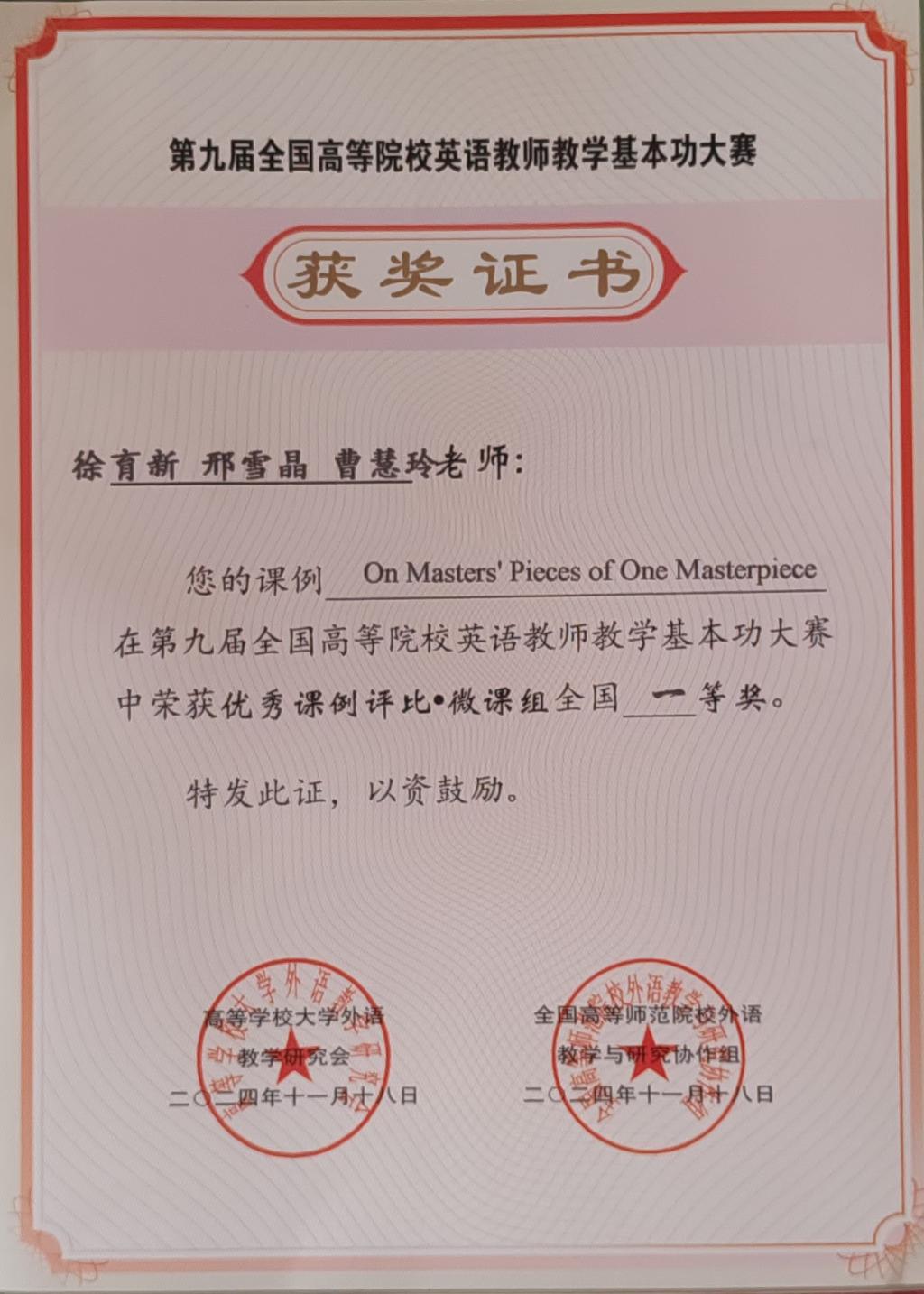 在本次大赛微课组赛道中,来自全国各大高校的260多位英语教师进行了微课作品比拼。杨晨晨老师的《寓意美好的纹样,独属中国之密码》微课作品从众多作品中脱颖而出,获特等奖;徐育新老师团队的《One Masters’ Pieces of One Masterpiece》结合多媒体技术,呈现了教学目标与实际应用的结合,获一等奖。