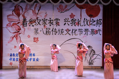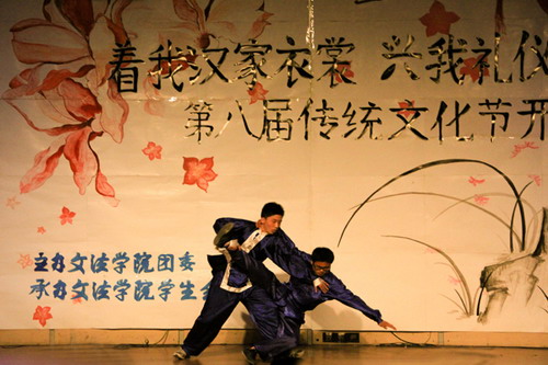 本次开幕式晚会融入武术、汉服、舞蹈等中国特色传统文化元素。传统武术表演《篆音》展现了中国武术的豪放与刚劲,舞蹈《秀坊》表现了中国传统舞蹈的唯美与柔情。本届开幕式创新的引入了汉服作为主打元素,进行了汉服展示环节《礼仪之邦》。最后,整场演出在绽放女声合唱团的《妻书》的歌声中落下帷幕。(通讯员:蔡慧慧 冯莎莎 实习编辑:于鑫)