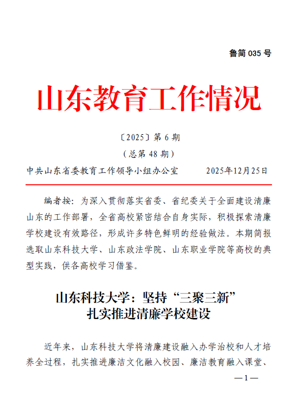 近日,《山东教育工作情况》〔2025〕第6期刊发《山东科技大学:坚持“三聚三新”扎实推进清廉学校建设》,对相关典型经验做法进行报道。