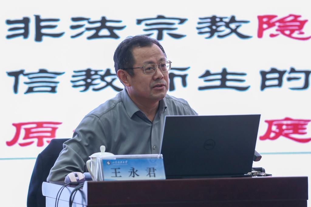 校党委统战部常务副部长王永君受邀为学员讲授培训班第一课。王永君以《新时代的高校宗教工作》为题,从我国的宗教现状与方针政策、宗教的本质和根源、形势任务与工作方法等三方面为学员带来了一堂兼具理论深度与实践指导意义的课程。王永君结合鲜活案例解读工作政策,并针对校园中可能出现的非法宗教活动给出具体应对思路,这份“工作指南”对团干部带头树立正确价值观、做好宗教工作具有重要意义。王永君希望团干部熟悉工作标准、保持敏感意识、掌握工作动向、关爱特殊学生,切实担当起工作责任,共同维护安全和谐稳定的校园环境。