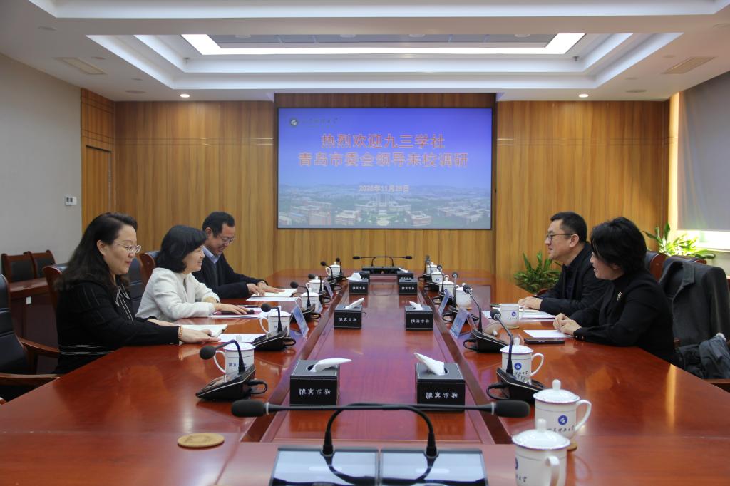 11月28日,九三学社青岛市委会专职副主委王波、秘书长刘宝霞一行来校就民主党派基层组织换届工作开展专题调研。校党委副书记郭益灵出席座谈会,统战部负责同志参加座谈。