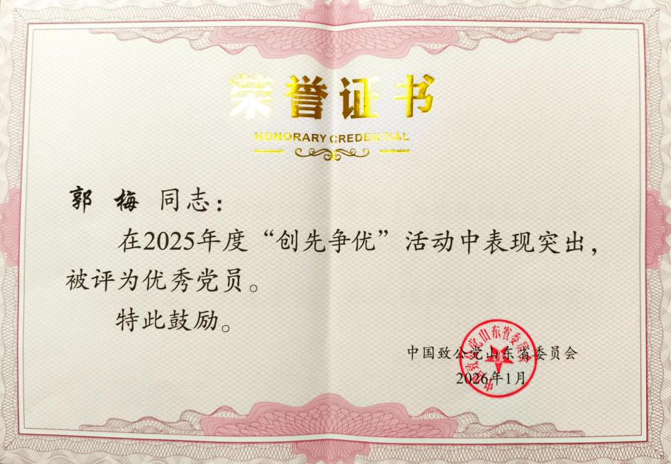 致公党山科大支部主委郭梅获评“2025年度中国致公党山东省委员会‘创先争优’优秀党员”。支部提交的2项成果被评为“2025年度全省参政议政优秀成果”,另有4项成果获评致公党青岛市委会“2025年度优秀参政议政成果”。