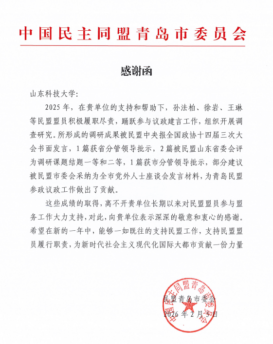 2月5日,民盟青岛市委会向我校发来感谢信,对我校在民盟盟员参与盟务工作中的大力支持,以及孙法柏、徐岩、王琳等民盟盟员2025年议政建言工作做出的贡献表示感谢。