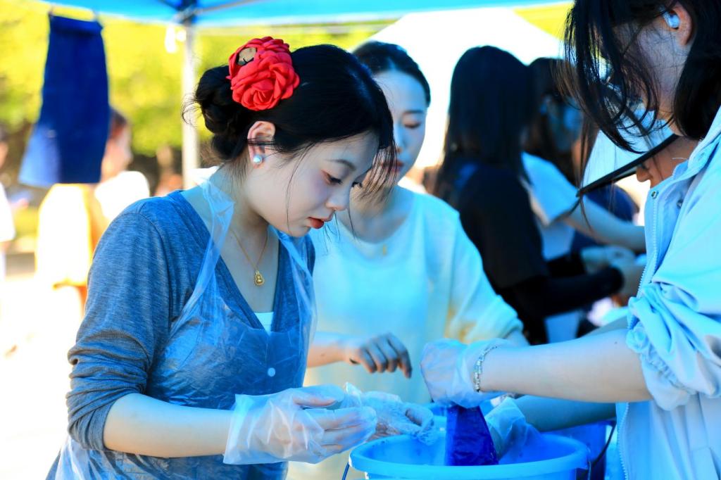 据了解,活动特邀皮影戏大师吴云凤、吹糖人名家周明铭、面塑艺术家赵丽华等非遗传承人现场展演。学子们亲手绘制皮影、操控影人,在光影交织中聆听《白蛇传》的经典桥段;体验糖人吹塑与面塑捏制,感受“化糖为艺”“以面传情”的精妙技艺;更有扎染体验区,天然植物染料在棉布上晕染出青花瓷般的纹路,引得师生们驻足赞叹。