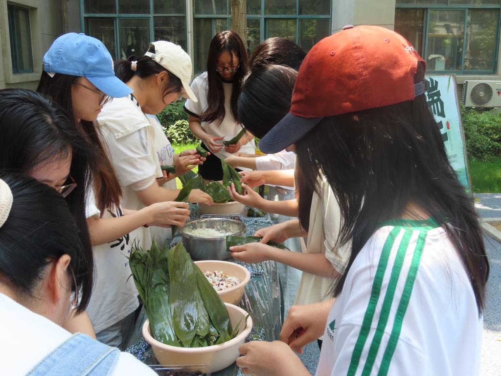 活动分为端午知识竞答、包粽子教学、包粽子竞速和创意粽子大赛,师生们踊跃参与,围在摆满粽叶、糯米、红枣等材料的桌子旁,纷纷大显身手,只见一双双巧手上下翻飞,捋粽叶、做漏斗、填糯米、封口、扎捆,不一会儿,形态各异的粽子便在大家手中诞生,尽管有些粽子形状不太规整,也丝毫不影响参与的热情,大家相互交流技巧,欢声笑语不断,学生社区里弥漫着浓浓的节日氛围。