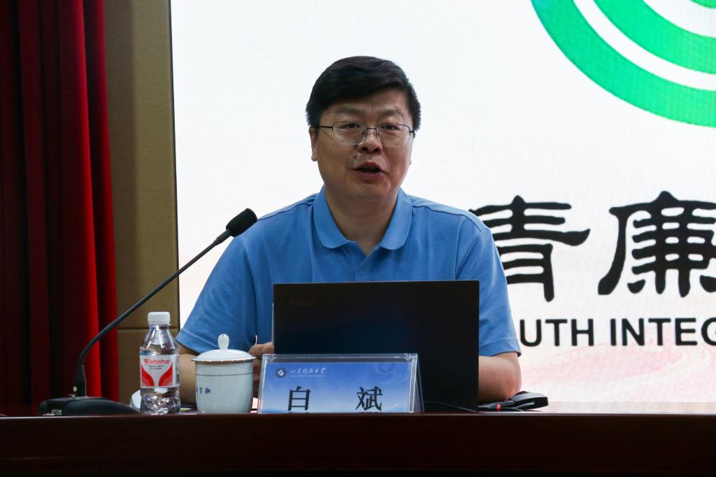 白斌为2025届毕业生党员提出三点希望,一是筑牢信仰根基,坚定至诚报国的理想信念;二是修身立德正己,涵养清正廉洁的新风正气;三是勇于担当作为,锤炼干事创业的过硬本领。号召同学们以青春之我擦亮清廉底色,奋力书写为中国式现代化挺膺担当的青春篇章。