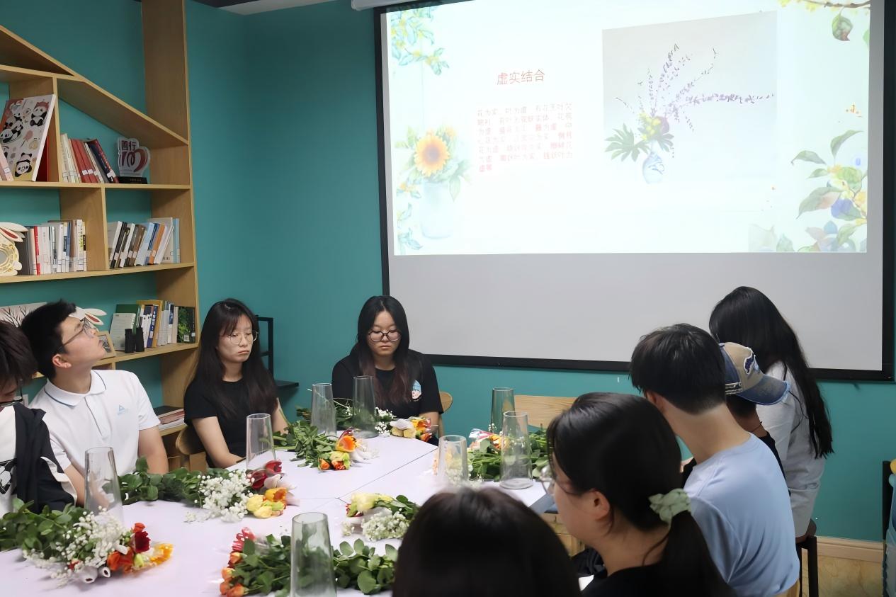 活动现场,专业花艺师以“花器中的东方美学”为主题展开理论讲解,启发同学们通过花与器的组合,于方寸间体会天地之美,打造花艺与哲学意境融合的当代生活美学。参与学生挑选自己喜欢的花材,修剪、搭配花枝,运用“上疏下密”、“错落有致”的技巧,将一朵朵鲜花编织成动人的画卷。当作品逐一亮相,枝蔓舒展成诗,此刻,活动不仅是技艺的比拼,更是凝聚青春,展现美育的盛会。