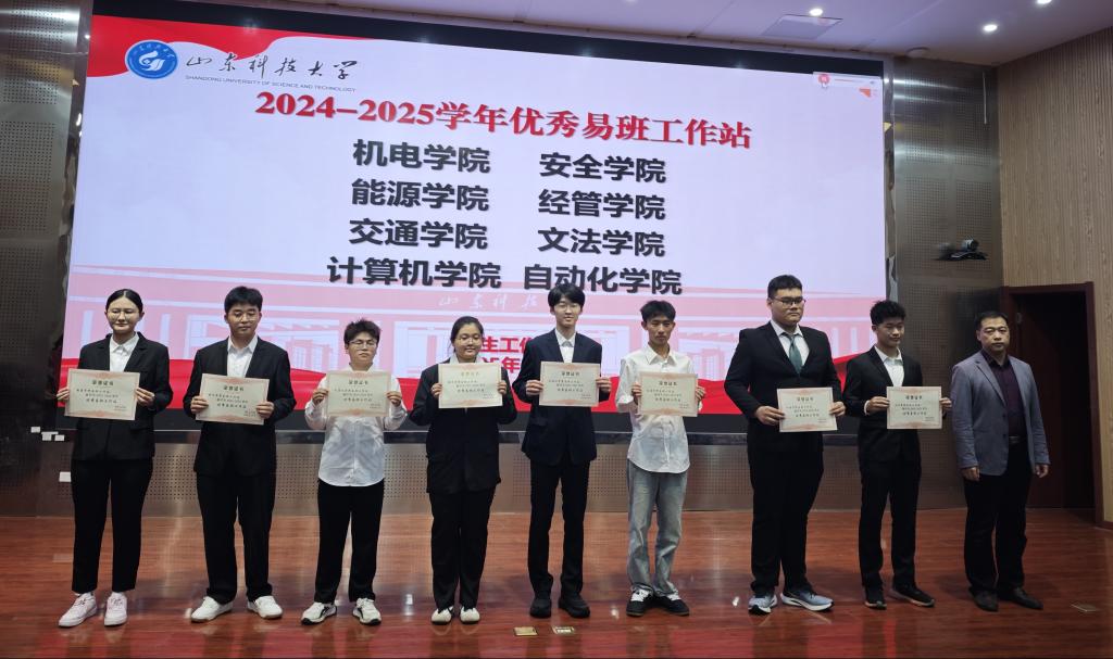 白镇源老师宣读《关于公布2024-2025学年优秀易班工作站、优秀指导老师获奖名单的决定》和《关于公布2025-2026学年“山科易班”学生工作站干部名单的通知》,学生工作处副处长靳凯为优秀单位和个人颁发荣誉证书。