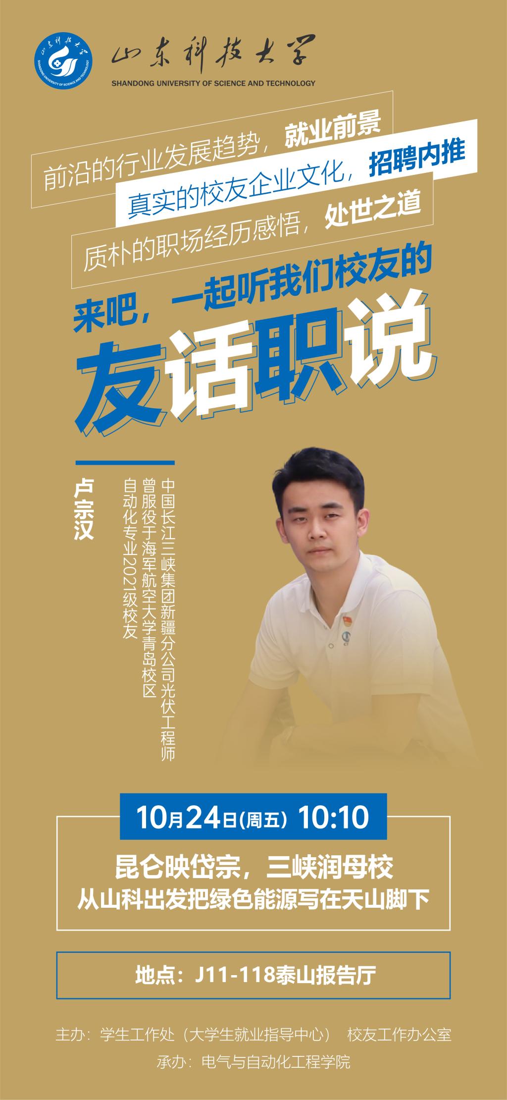 友话职说:10月24日(周五)10:10 昆仑映岱宗,三峡润母校——从山科出发把绿色能源写在天山脚下
