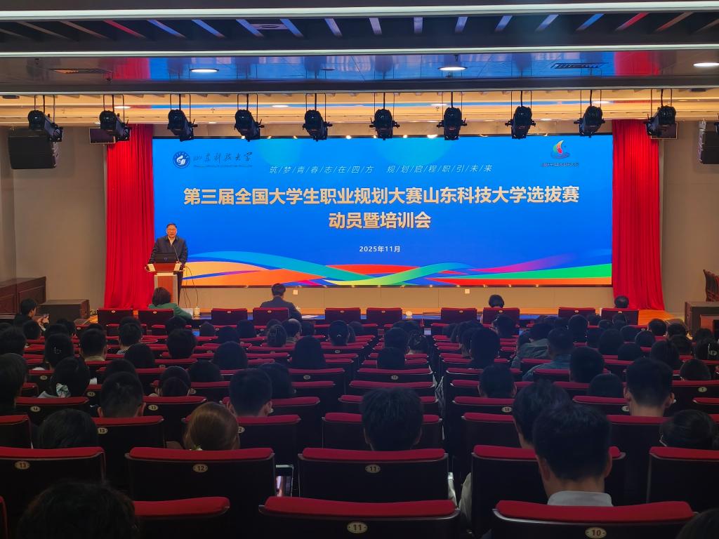 为贯彻落实党中央、国务院关于做好高校毕业生就业工作的决策部署,落实《中共中央办公厅 国务院办公厅 关于加快构建普通高等学校毕业生高质量就业服务体系的意见》精神,强化高校生涯教育和就业指导,增强大学生职业规划意识,提升全体辅导员生涯教育与就业指导能力水平,11月24日,学校举办第三届全国大学生职业规划大赛山东科技大学选拔赛动员暨培训会。校党委常委、副校长诸葛福民作部署动员,山东大学哲学与社会学院党委副书记翁祥栋、青岛大学学生生涯发展中心主任李莹应邀参加专题分享。学生工作处、团委、研究生院等单位负责人,各学院学生工作负责人、职规赛指导老师、全体辅导员及学生代表参加活动。活动由学生工作处副处长、大学生就业指导中心副主任孔环主持。