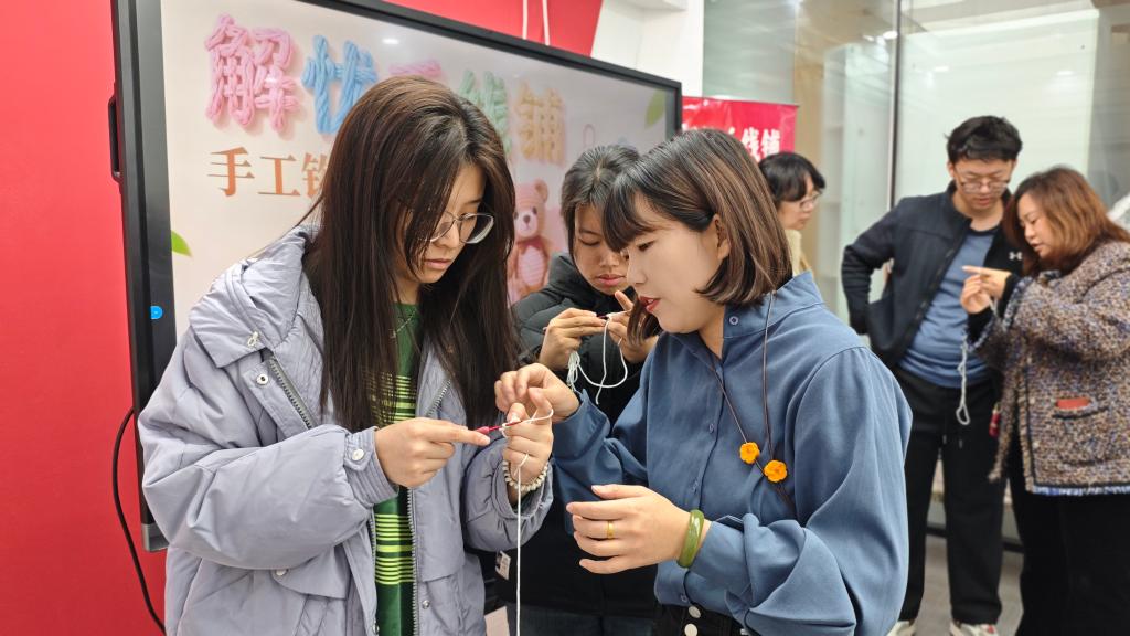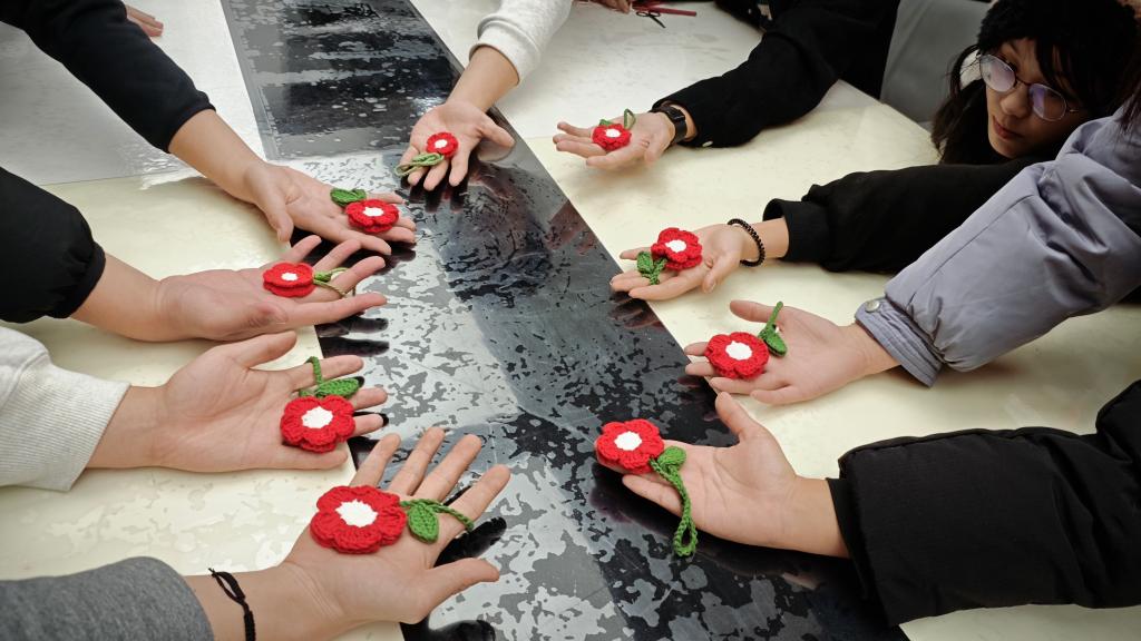 同学们热情高涨,围坐在一起认真学习、相互探讨。指尖翻飞间,原本松散的毛线逐渐成型,一个个小巧玲珑的红色花瓣慢慢绽放,最终汇聚成一朵朵鲜活可爱的小红花。来自能源学院的白同学笑着展示自己的作品:“平时很少接触手工,这次体验,不仅学会了一项新技能,还感受到了慢工出细活的乐趣。我还自创了立体的四瓣花,看着自己亲手钩成的小红花,特别有成就感。”