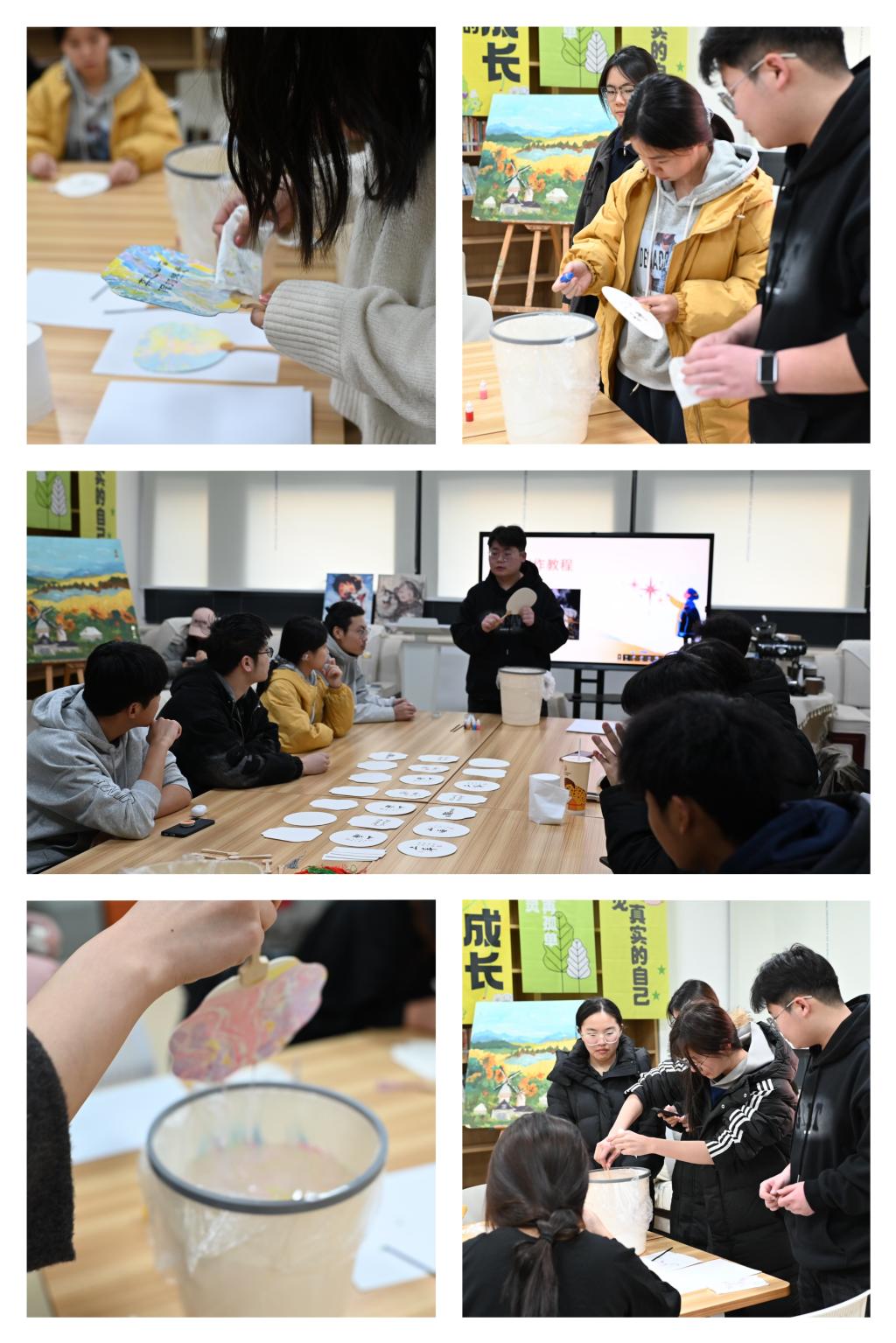 活动以“指间绘心,时光慢叙”为主题,同学们在素扇上自由运用颜料与画笔,或勾勒淡雅花影、或晕染朦胧水色。伴随着轻柔的背景音乐,大家沉浸于每一笔的描绘,在色彩与布局中逐渐释放情绪,体验专注创作带来的内心安宁。现场氛围温馨而宁静,艺术成为连接自我与情感的温柔媒介。来自化工学院的孟子傲同学表示:“在忙碌的学期末,能静下心来画一画,感觉整个人都放松了,像是给心灵放了个假。”