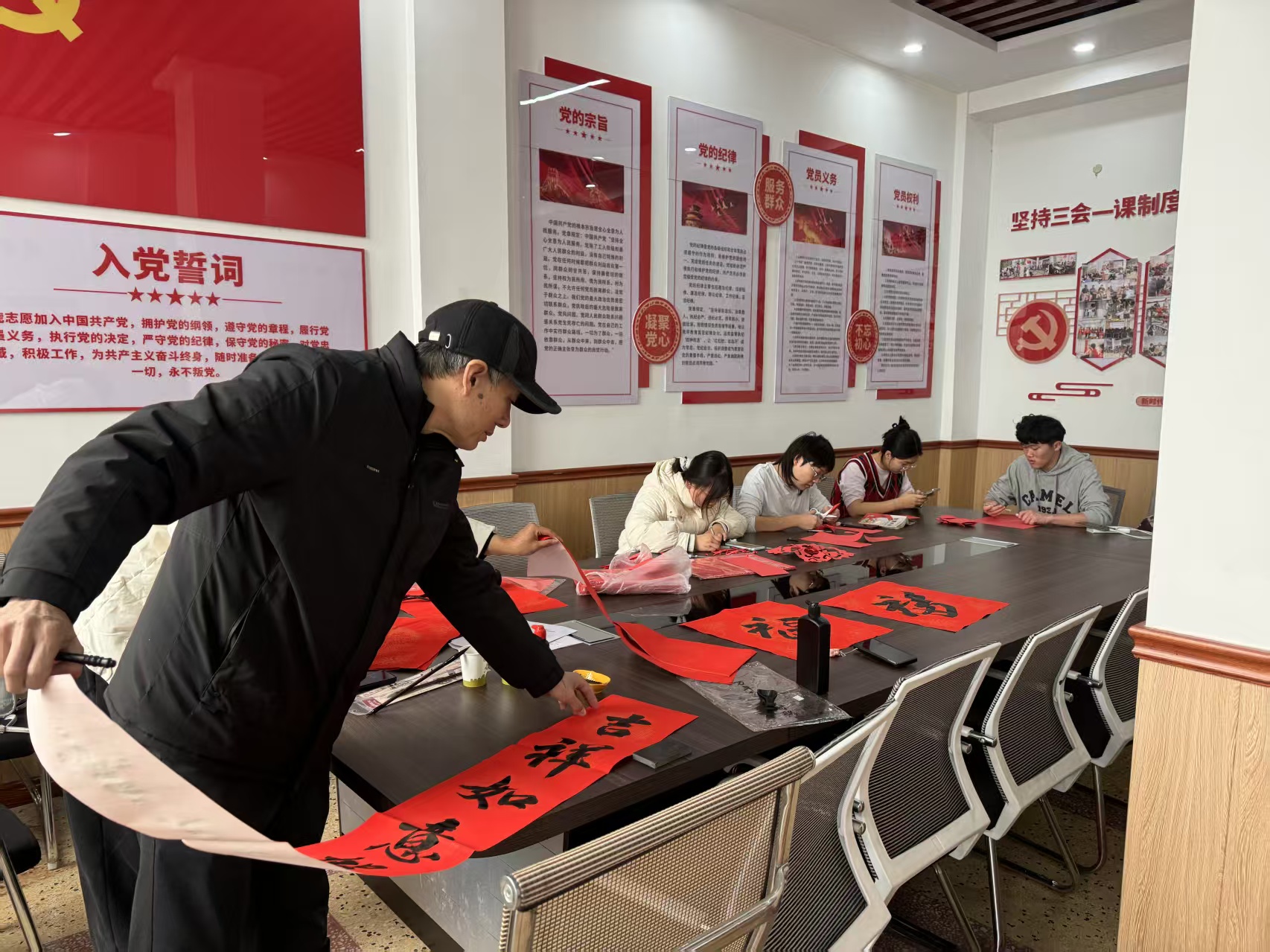 迎春送福,情暖村民。1月21日,主题活动在里辛集贸市场启动。上午,团队在第一书记助农超市设立“迎春送福”摊位,由书法特长学子及特邀本地书法爱好者现场书写春联、福字,免费赠予过往村民,同时在征得同意后为村民拍摄合影,定格团圆时刻。下午,团队赴街道党群服务中心红领驿站参观学习,深入了解基层治理模式与服务体系,拓宽对乡村治理与发展的认知视野。
