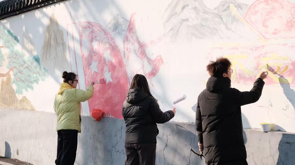 产业兴农,美丽乡村。1月22日,实践团队开启“产业新篇”实践环节。上午,团队走进棋山观村大棚种植基地,实地探访现代化农业发展成效,在农户指导下掌握特色果蔬种植技术与销售模式,参与草莓采摘等农事劳作体验。下午,团队赴圈里村开展美丽乡村墙绘补色工作,在村委工作人员指导下,对褪色、破损墙面进行清理、补底及精细描绘,以画笔赋能美丽乡村建设,打造地域特色景观。