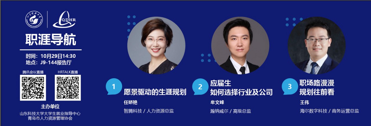 为帮助我校学生树立正确的求职择业观念并全面提升职业能力与素质,学校联合青岛市人力资源管理协会邀请三位岛城资深专家举办“职涯导航”报告会,为同学们分析就业形势、分享经验技巧,现将相关事项通知如下。