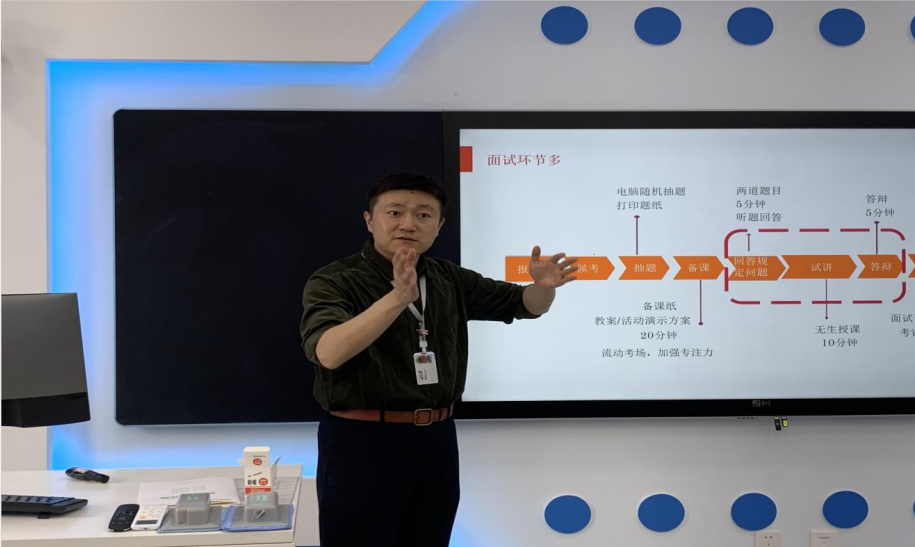 4月20日下午,“职”等你来求职训练营在J1-410智慧教室成功举办。中公教育面试研究院副主任刘浩老师对19名学员开展了教师资格证备考面试专题训练。