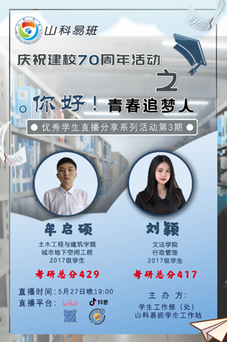 为树立科学成才导向,营造善学、勤学、乐学的良好学习氛围。5月27日,山科易班举办了“你好!青春追梦人之学长学姐说”优秀学生直播分享活动第3期——考研学霸专场,分别邀请了考研成绩429分、417分的土建学院牟启硕同学、文法学院刘颖同学一同做客直播间,就考研规划、复习经验、学习与生活时间管理等方面进行了分享与答疑,共有3300余名学生观看线上直播。直播由山科易班学生工作站策划部干事、文法学院马佳文主持。