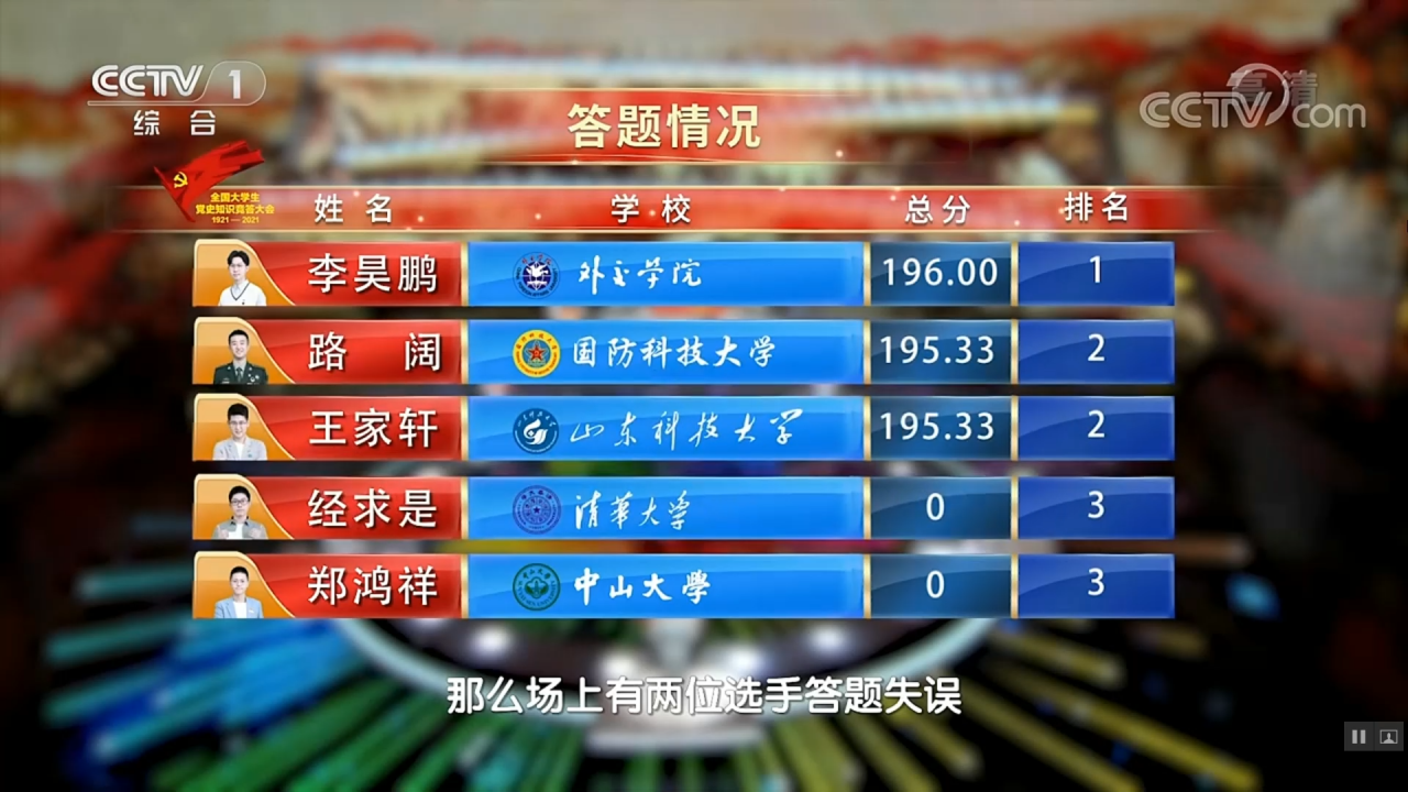 6月6日晚,《全国大学生党史知识竞答大会》于CCTV-1黄金档正式播出。山科学子王家轩作为百人团参赛选手,于首期节目的五星挑战赛第二轮比拼中,以百人团当轮前两名的成绩顺利突围,登上大会主舞台。