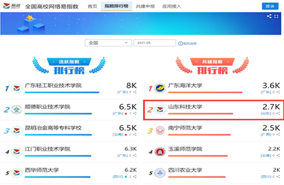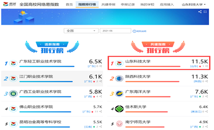 近日,教育部易班发展中心公布2021年6月全国高校网络易指数排行榜,山科易班共建指数为11500,荣登全国1800余所易班共建高校共建指数排行榜榜首。
