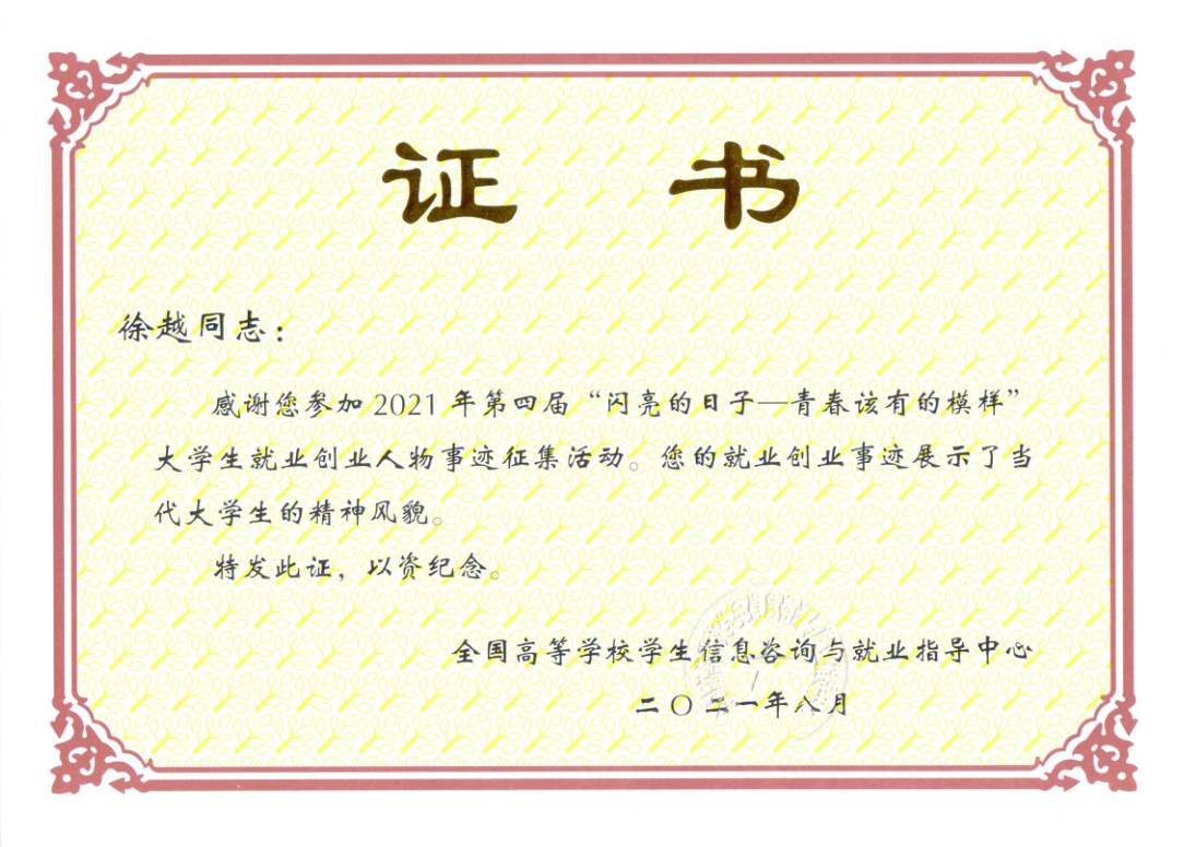 此次活动由教育部全国高等学校学生信息咨询与就业指导中心举办,经过学校初选申报、山东省教育厅复审推荐以及教育部遴选,我校选送的徐越同学在全省148名大学生就业创业人物事迹中脱颖而出,全省共有15名学生获此殊荣。据悉,入选的典型人物事迹将在全国高校学生信息咨询与就业指导中心官网专栏报道,在《中国大学生就业》杂志、新职业网、学信网、各省市就业指导中心网站刊发,并将出版发行。